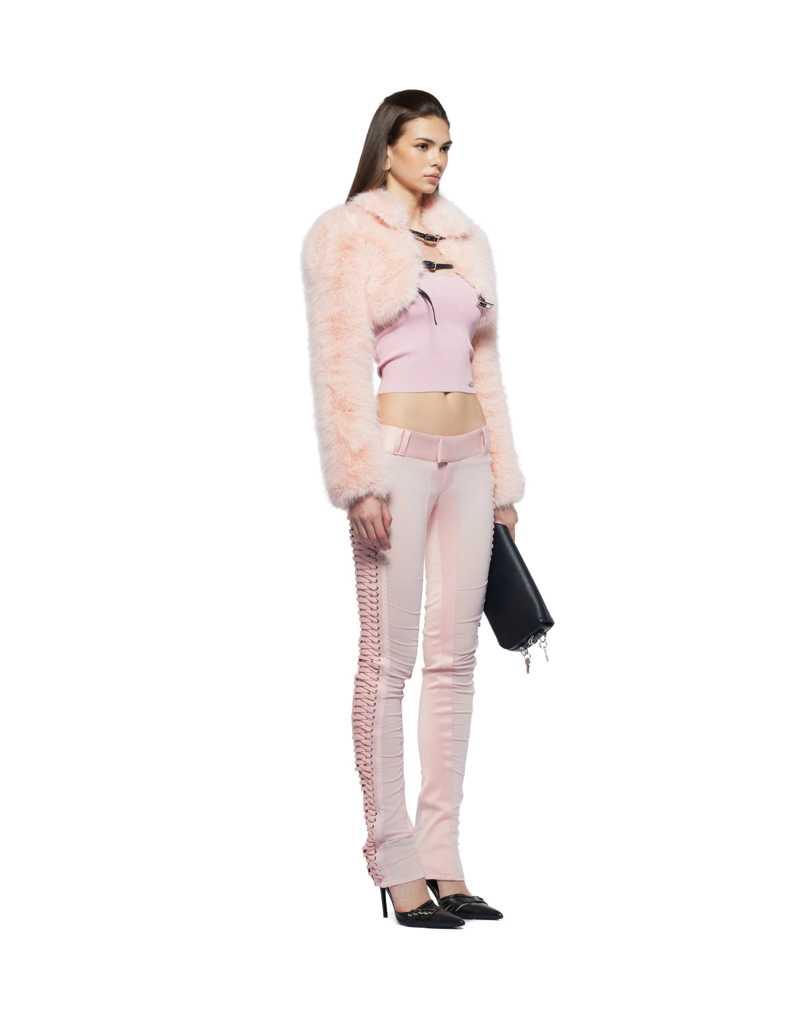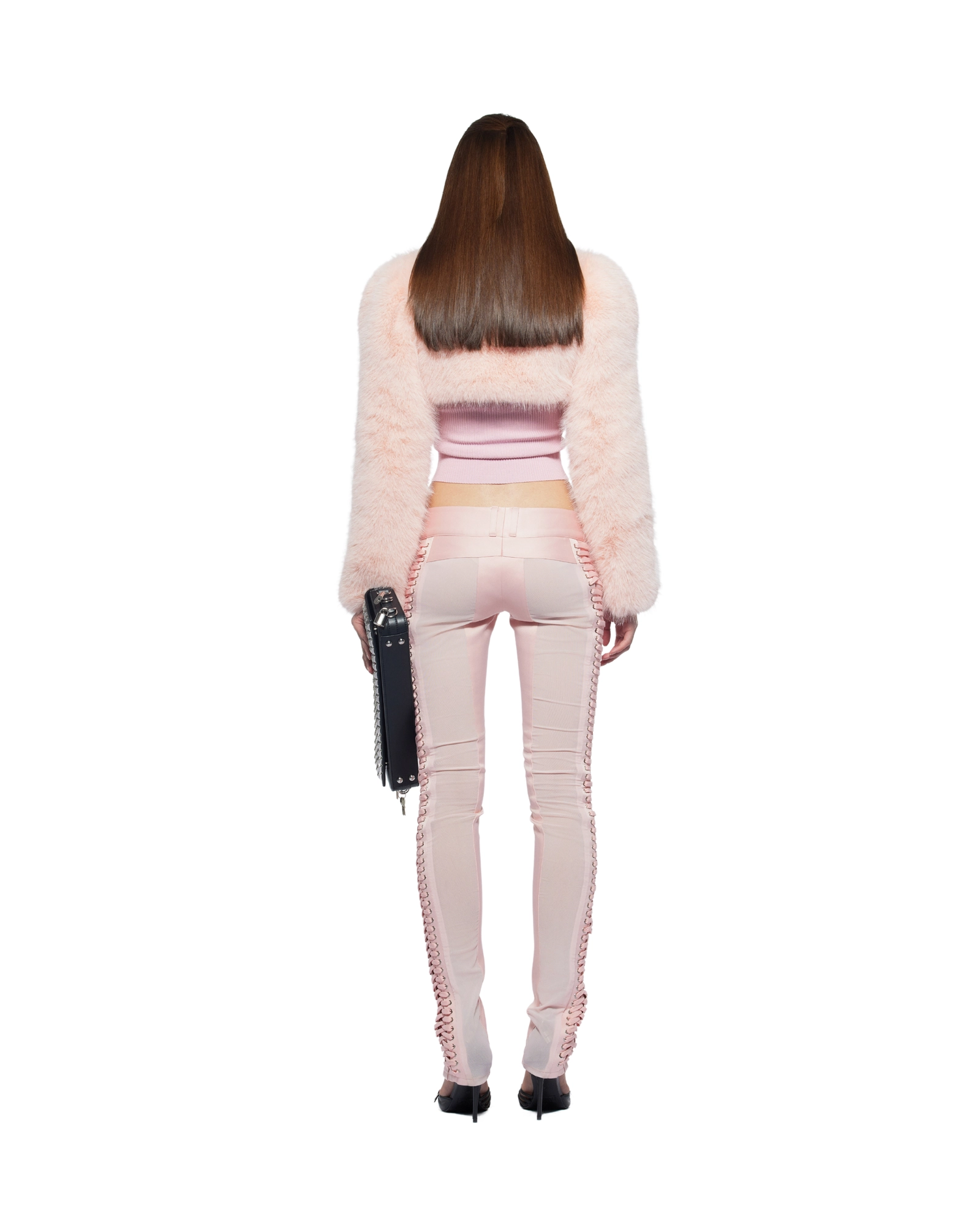 Fur trim bustier corset Boned corset Heart-shaped bust line Mid-hip length Curved side panels Lace-up back with zip closure Hourglass silhouette Fully linedMaterial: